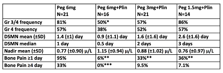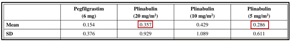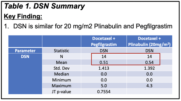 It’s clear from the data that concurrent administration of Plinabulin doesn’t allow for lower doses of Neulasta. The 3mg and 1.5mg combination arms are worse on DSN than 6mg monotherapy.