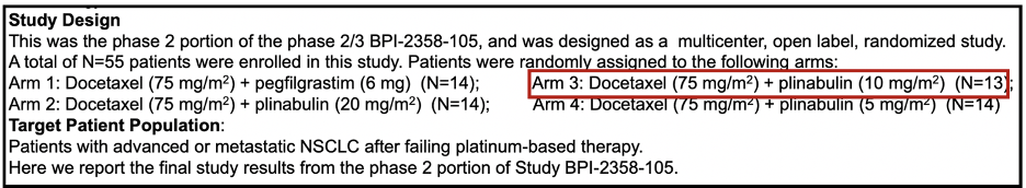 Investors were first notified of the change in an October 2018 press release announcing “positive efficacy and safety data”. BYSI only provided pooled data from the combination arms. No information has been disclosed for the three Plinabulin monotherapy arms.