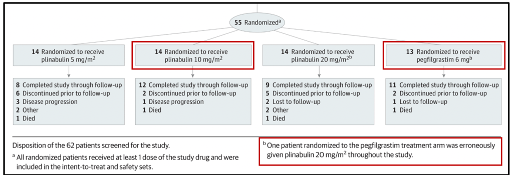 Trial data changed again in a paper published by Study 105 investigators in the September 2020 issue of JAMA Oncology. The paper noted 13 of 42 (30%) patients in the Plinabulin arms discontinued treatment prior to study follow-up vs 15% of patients in the Neulasta and “one patient randomized to the Neulasta treatment arm was erroneously given 20mg/m2 Plinabulin throughout the trial.”