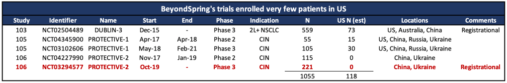 - We estimate only 10% of enrollment in BeyondSpring’s mid and late-stage trials is based in US. Majority of sites and subjects are in China and Eastern Europe where trial conduct is questionable