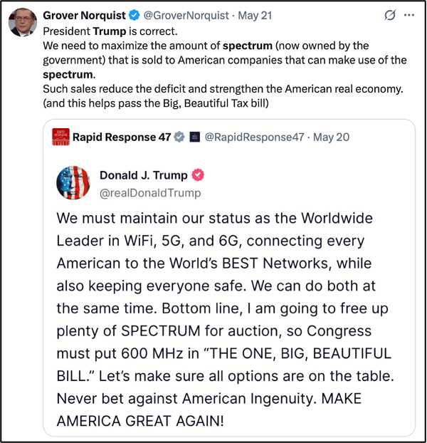 - The domestic policy bill mandates spectrum auctions, not grants, in opposition to NextNav’s proposal.