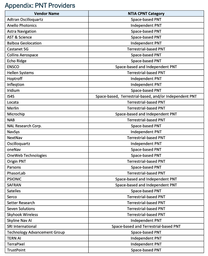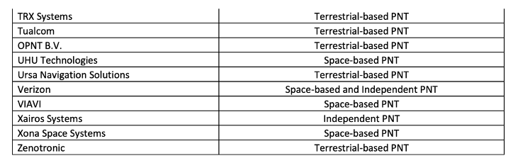Appendix 2: PNT Providers filed into NOI record by NTIA