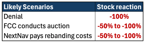 Notwithstanding the stretched premium to comps, we think best case current shareholders get buried by dilution after NextNav is required to buy the spectrum at auction and pay for retuning costs estimated at over $30B. If the FCC flatly denies the petition, we think equity trades to $0 as debt dwarfs asset value.