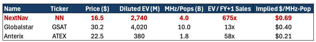 - NextNav’s $2.7B fully diluted EV implies ~$0.70 per MHz-POP, a 200% premium to comp Anterix which owns broadband licenses.