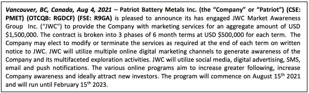 Under the name Patriot Battery Metals, the Company has employed stock promotion from marketers including Red Cloud Financial Services, Proactive Investors, Resource Stock Digest, and an entity known as JWC Market Awareness Group. Patriot’s engagement of JWC was particularly aggressive: between August 2021 and January 2022, Patriot paid JWC $1m.