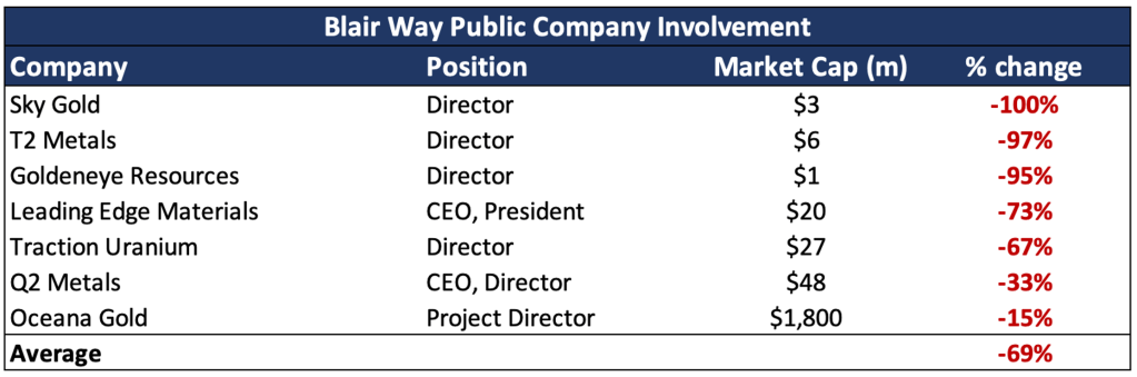 While we acknowledge that failure is common in junior mining, considering Patriot’s run to a multi-billion-dollar EV at such an early stage, we think it’s worth highlighting the poor stock performance of companies associated with CEO Blair Way.