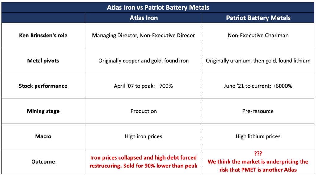 - Ex-Pilbara CEO Ken Brinsden’s appointment as Non-Executive Chairman has buoyed the stock. Yet, Patriot also mirrors his time as MD at Atlas Iron. Like Patriot, Atlas soared on a pivot to a hyped metal but eventually restructured and sold at a 90% discount to its peak valuation.