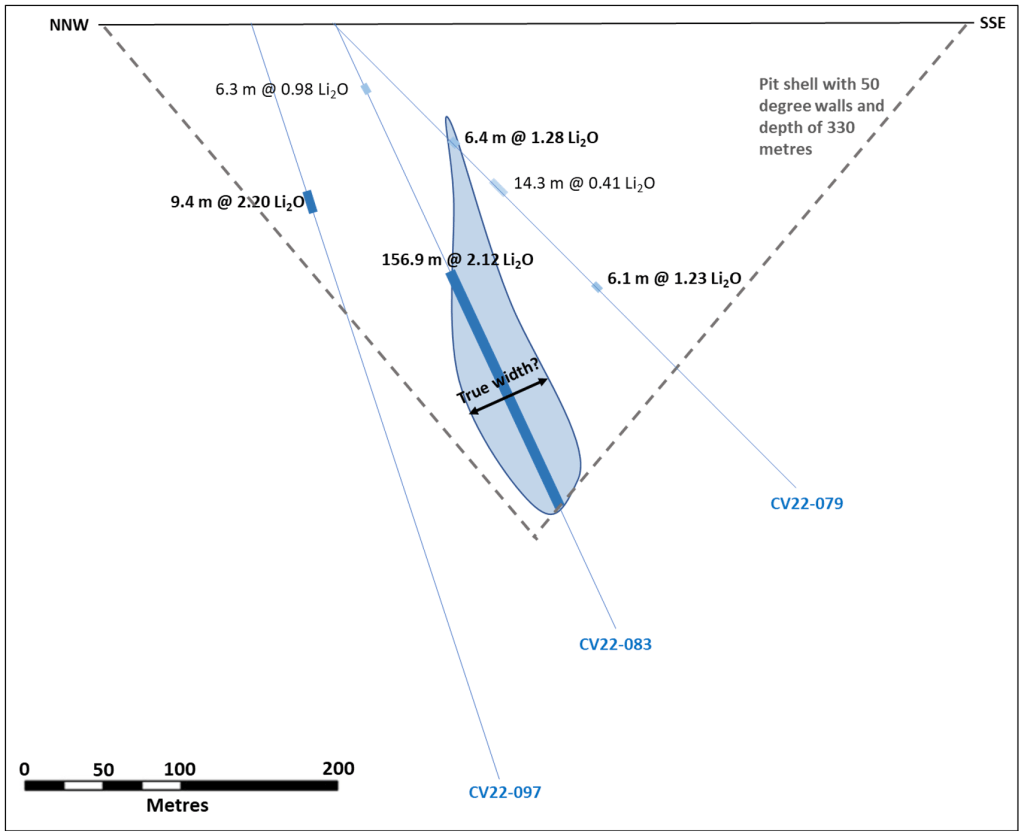 One of the most impressive holes at Corvette is CV22-083 which was drilled at -65° and returned an impressive 157 m 2.12% Li2O intercept (Patriot’s 2021-22 campaign data can be found here). However, CV22-083 may overstate the true width of the mineralization if the structure is steeply oriented – for example 60 to 70 m wide would be a lot less impressive than 157 m. Also, the intercept from CV22-079, drilled from the same platform but at -45°, was only 14.3 m grading 0.41% Li2O. If the structure is steeply dipping this likely means the high grade in CV22-083 does not extend very far upward.