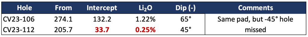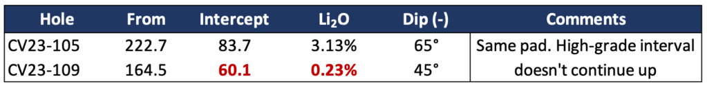 CV23-105 is a -65° hole with an excellent intercept of 83.7 m at 3.13%. However, CV23-109 was drilled from the same pad at -45° but only hit 60.1 m at 0.23%, indicating the high-grade interval in CV23-105 doesn’t continue upwards or it would have been intersected downhole in CV23-109. Or perhaps the mineralization is not vertically oriented.