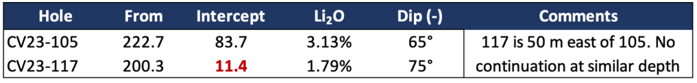 CV23-110 was drilled 50 m east of CV23-109 and both are -45° holes. Yet CV23-110 hit much better grades (85 m at 1.04%) than CV23-109 (60.1 m at 0.23%). This may indicate the higher-grade zone intersected by CV23-105 suddenly turn shallower or that it’s very thin and hole CV23-117 missed it because it was too steep. Again, we would know more about the shape and orientation of the structure if Patriot was publishing cross sections.