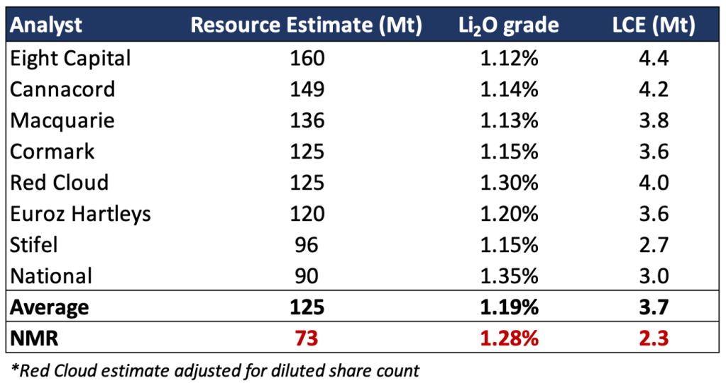 In one-on-one investor conversations and interviews, management said it expects an initial CV5 resource of at least 100Mt with upside potential from outcrops yet to be drilled extensively. Sell-side estimates of Corvette’s size range from 90-160Mt graded between 1.1% to 1.3% of Li2O or 2.7-4.4Mt lithium carbonate equivalent (LCE).