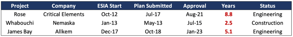In investor presentations, Patriot compares Corvette with several James Bay projects. Note that for two of them the ESIA process took over 5 years to complete. Allkem’s James Bay received federal ESIA approval in January, over five years after submitting its preliminary project description to the Canadian Environmental Assessment Agency. Allkem has still not begun mine construction as provincial and construction permitting [Pg. 18] remain in process.