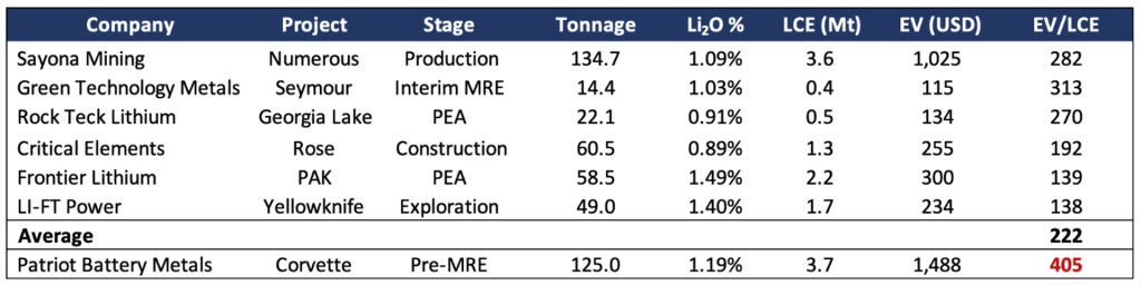 Comparing Patriot to other pre-production (or just started production in Sayona’s case) North American spodumene developers reveals how expensive it is. Using the 3.7Mt LCE average analyst estimate for Corvette, Patriot trades at the highest EV/LCE multiple of the group despite being second furthest from production.