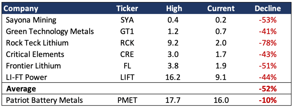 Patriot is also exceeding its peers on price performance. Lithium stocks in general have declined from peaks earlier in the year, in part due to the decline in lithium prices. Patriot is significantly outperforming when measured from peak levels to current: