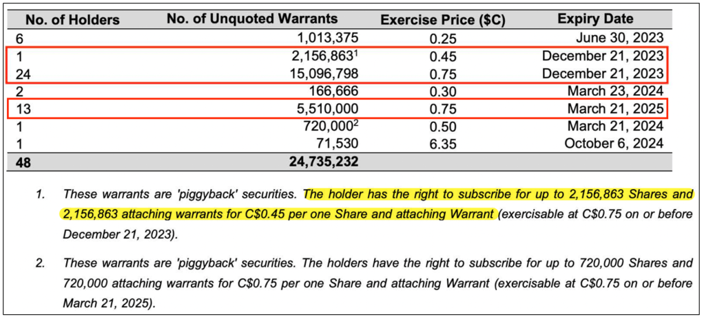 Besides a relatively full valuation, near term Patriot’s stock carries the weight of 50m deep in the money stock, options, and warrants making up nearly 50% of outstanding shares. As an obscure junior miner, Patriot conducted almost two dozen capital raises 90% below current levels. Particularly concerning are offerings done in December 2021 and March 2022 for a total of 26m shares and 24m warrants (23m of which are unexercised as of June) with lock up periods that ended between December 2022 and the end of March 2023.