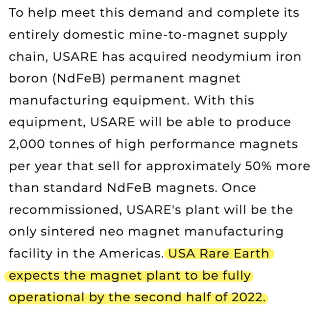 Later in 2021, Althaus guided for magnet production in the second half of 2022. This target was inserted into USAR’s website at the time: