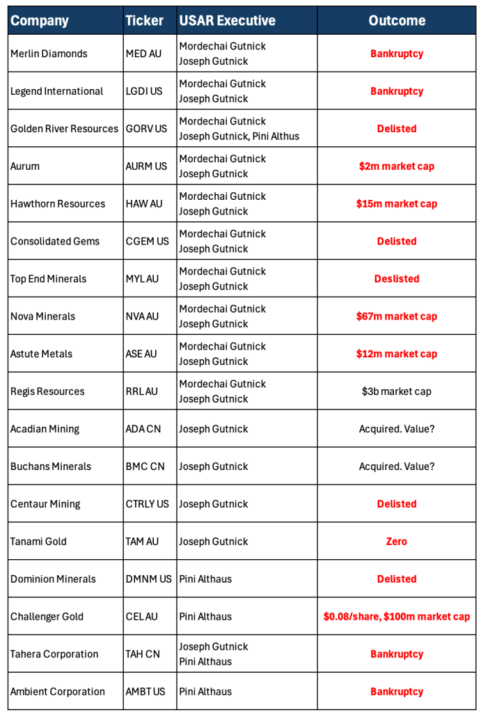 USAR was founded by Mordechai Gutnick, an Australian entrepreneur who with his father has been involved in multiple mining companies that have gone bankrupt or been delisted In 2024, Mordechai was also involved in a loan scandal at an Australian company that led to his father being barred by the Australian Securities Regulator from holding management positions.