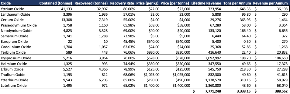 Based on the PEA’s pricing and production assumptions, we calculated the implied revenue for each mineral, over the mineral’s life (our calculation has a 0.08% difference vs. the gross revenue in the PEA, likely due to rounding). Approximately $3.3B or 43% of Round Top’s lifetime revenue is derived from just three heavy rare earth elements – Ytterbium, Thulium and Lutetium – which according to the PEA are “little used” but critical to the economics of Round Top.