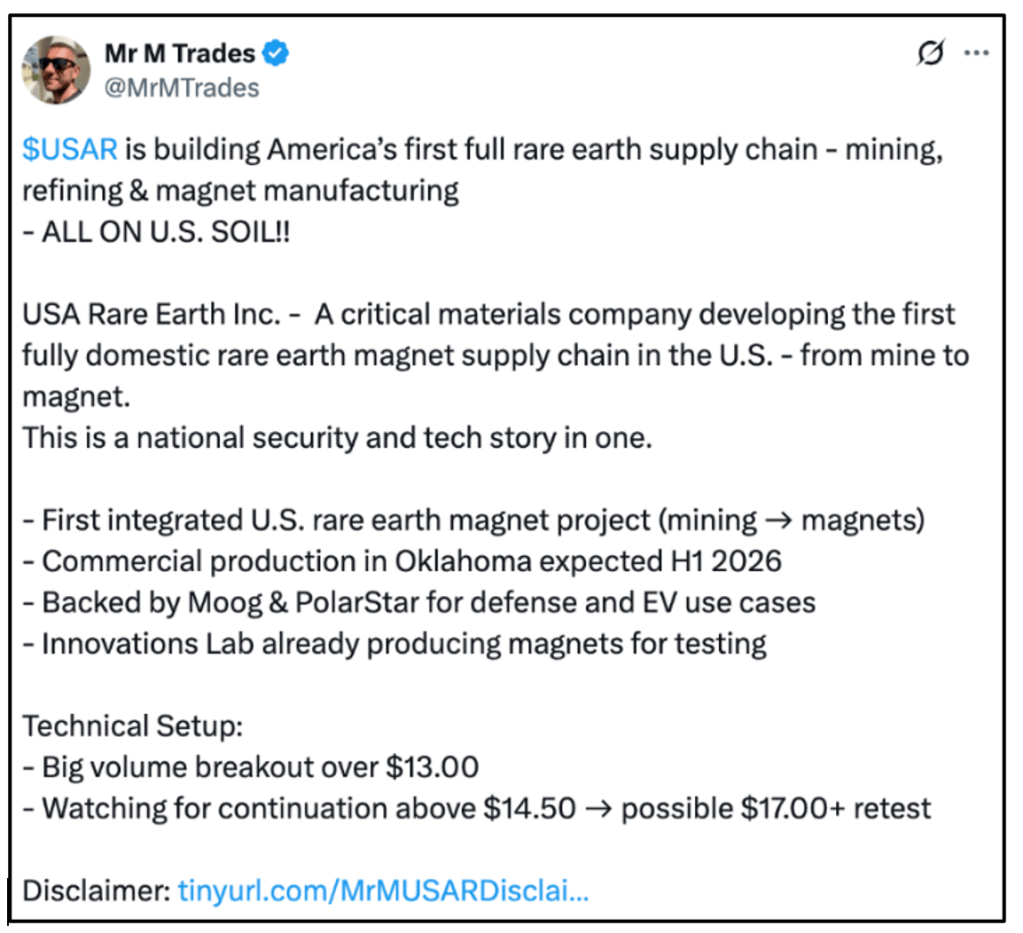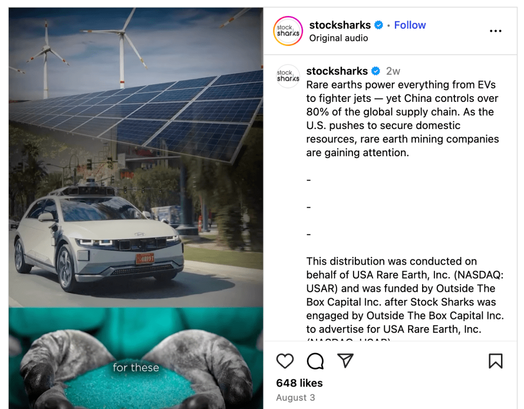 - In May 2025, USAR hired a penny stock promoter, Outside the Box Capital (OTB), for 25K USAR shares (worth ~$400K today) and $90K in cash. On August 3, 2025, OTB began a promotional barrage via third party promoters on X, Instagram and YouTube pumping USAR shares to retail investors. OTB’s track record speaks for itself with companies down an average of -71% since engagement date.