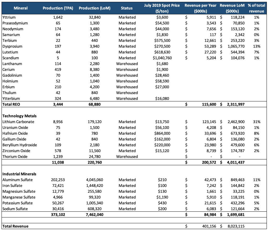 Like the 2013 PEA, the 2019 PEA uses wildly optimistic assumptions to manufacture attractive economics. Based on the prices disclosed and production forecast for each mineral, revenue on an annual basis and Life-of-Mine basis is ~$400M, excluding revenue from warehoused minerals.