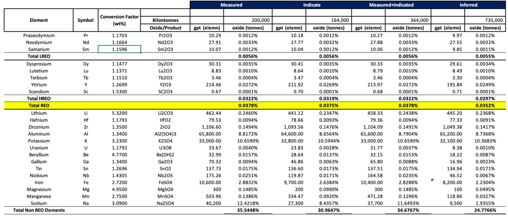Below is the resource estimate from the 2019 PEA expressed as % oxide/product content.