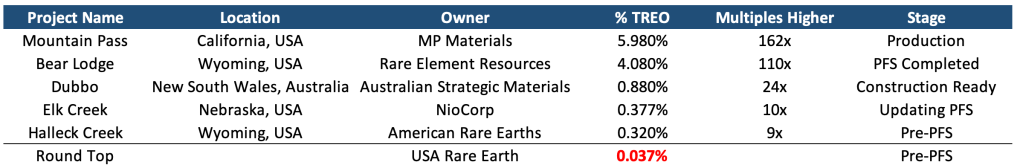 Round Top’s total rare oxide (TREO) content is just 0.06%, which is 1/100th of the only operating rare earth mine in the US, MP Material’s Mountain Pass, and only 3x the natural occurrence of rare earth elements in the Earth’s crust.