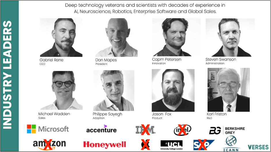 During the same presentation, Hendrickson touts a Verses management team with experience from notable companies: