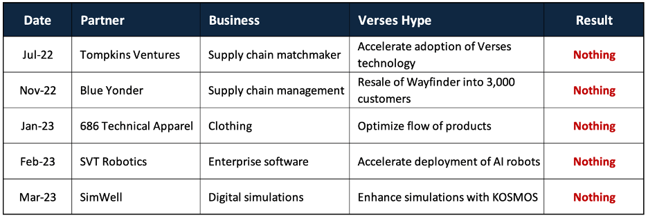 And while Rene claimed the enormous beta demand would be limited to “hand-selected” partners, the reality is quite different. In 6 months, only 6 partners have been announced: NASA and Volvo are fake and/or misrepresented, and the other 4 are obscure counterparties, 3 of whom were already linked with Verses in partnerships that were initially hyped but have produced little more than press releases.