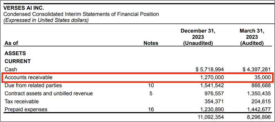 Moreover, Verses appears to be having trouble collecting payment from NRI. In the latest quarterly report filed on February 14, accounts receivable ballooned by $1.2m in FY 2023, nearly the amount due from NRI ($350k per quarter).