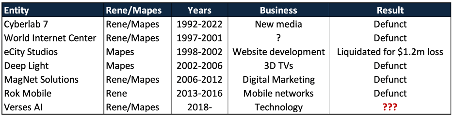 Rene and Mapes often tout decades of experience in technology. However, we find both led or were involved in a series of obscure and now mostly defunct entities.