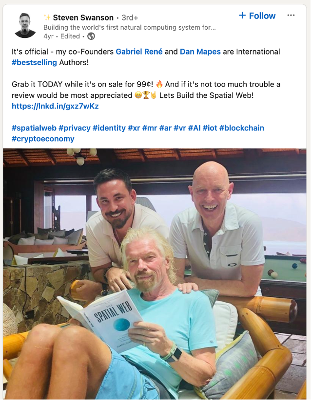 Mapes and Rene co-wrote a book titled The Spatial Web which they tout as a “#1 International Best Seller”. This might sound impressive, but the book was self-published on Amazon where the “Bestseller” label is a notorious scam, easily manipulated by authors who self-publish a book, assign it to obscure categories, reduce its price, and ask friends to buy it. In the middle of March, The Spatial Web was ranked #573,738 overall, but #5 in Holography, behind Macrame Magic and two notebooks of blank paper.