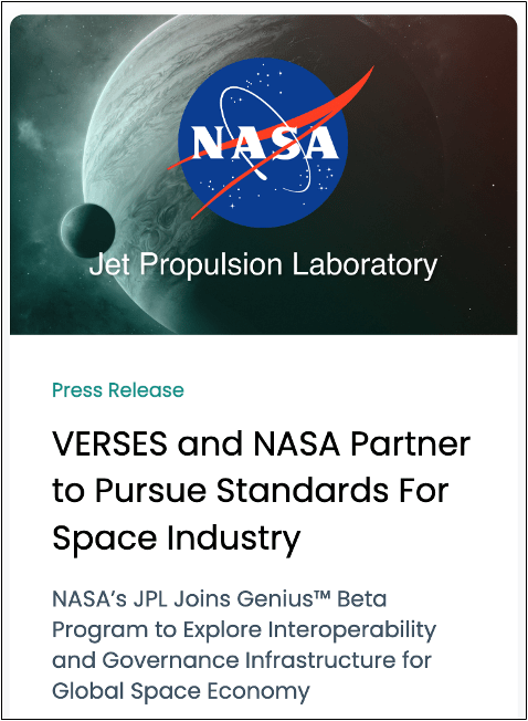 In November 2023, Verses issued a press release titled “VERSES and NASA Partner to Pursue Standards for Space Industry”. Verses claimed NASA’s Jet Propulsion Laboratory (JPL) was joining the Genius beta program to “explore interoperability and governance infrastructure for global space economy”.