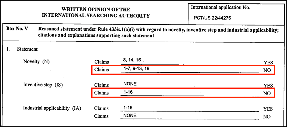 Of 51 total claims, only 16 were examined for novelty and inventiveness since the rest were determined to be unrelated from a patentability perspective. Of those 16 claims, the ISA concluded 13 lacked novelty, and none contained an inventive step.