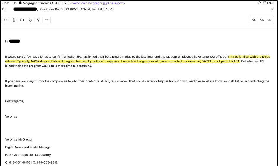 We contacted NASA JPL to confirm a partnership with Verses. A spokesperson said while she was not familiar with the Verses press release, it violated NASA policy with unauthorized use of NASA’s logo, and erroneously described Defense Advanced Research Projects Agency (DARPA) as part of NASA.