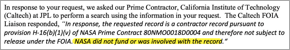 JPL cited a section of its NASA contract that protects procurement records from disclosure, including “pre-decisional, or similar documents relating to [JPL’s] deliberative process in selecting subcontractors.”