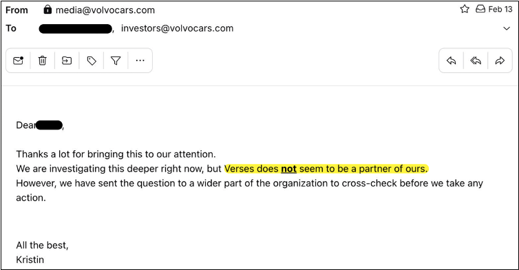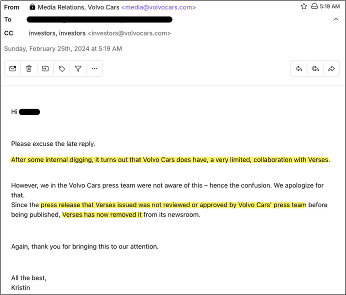 Two weeks later, the spokesperson reported that after an internal search, a “very limited” collaboration was found, and that Volvo Cars forced Verses to remove its press release (archived).