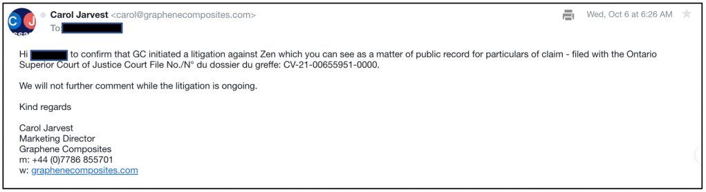 GC feels differently. We spoke with GC representatives who allege that ZEN stole the technology, characterizing the situation as “tied up in a severe legal battle”. Indeed, in January 2021 Graphene Composites filed a lawsuit in the Ontario Superior Court of Justice (File No. CV-21-00655951-0000).