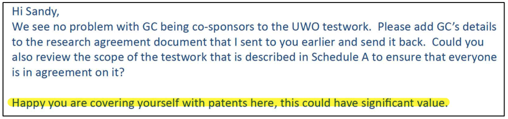 What struck us most about the lawsuit was the description of ZEN’s alleged blatant self-dealing and deception. As alleged by GC, Dubé and ZEN CEO Greg Fenton were continually prodding for technical information about the ink, stressing an urgency to qualify for Canadian government funding for PPE production (in the end ZEN never received funding from these programs). As is evident in the emails provided by GC, the technical information consistently flows one way – from GC to ZEN.