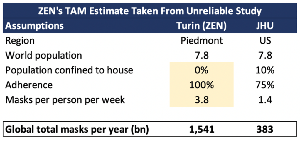 ZEN investor presentations contain profitability estimates which appear attractive – even a small share of a large face mask TAM produces gross profitability figures which at the high end are multiples of the current market cap. But ZEN is basing its projections on a poor, overinflated TAM estimate in our view.