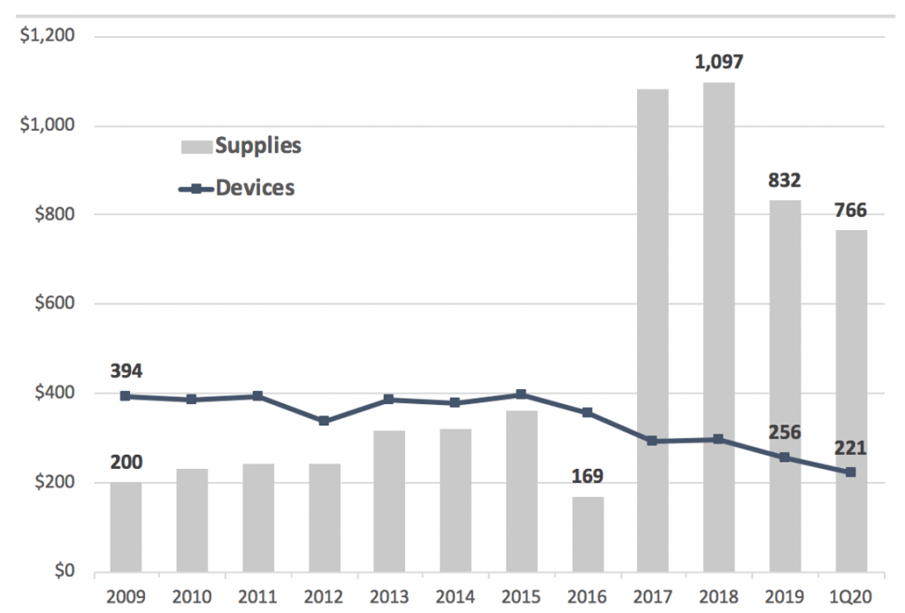 Looking at each segment, average device revenues fell 40% but the average for supplies increased over 400%, spiking in 2017.