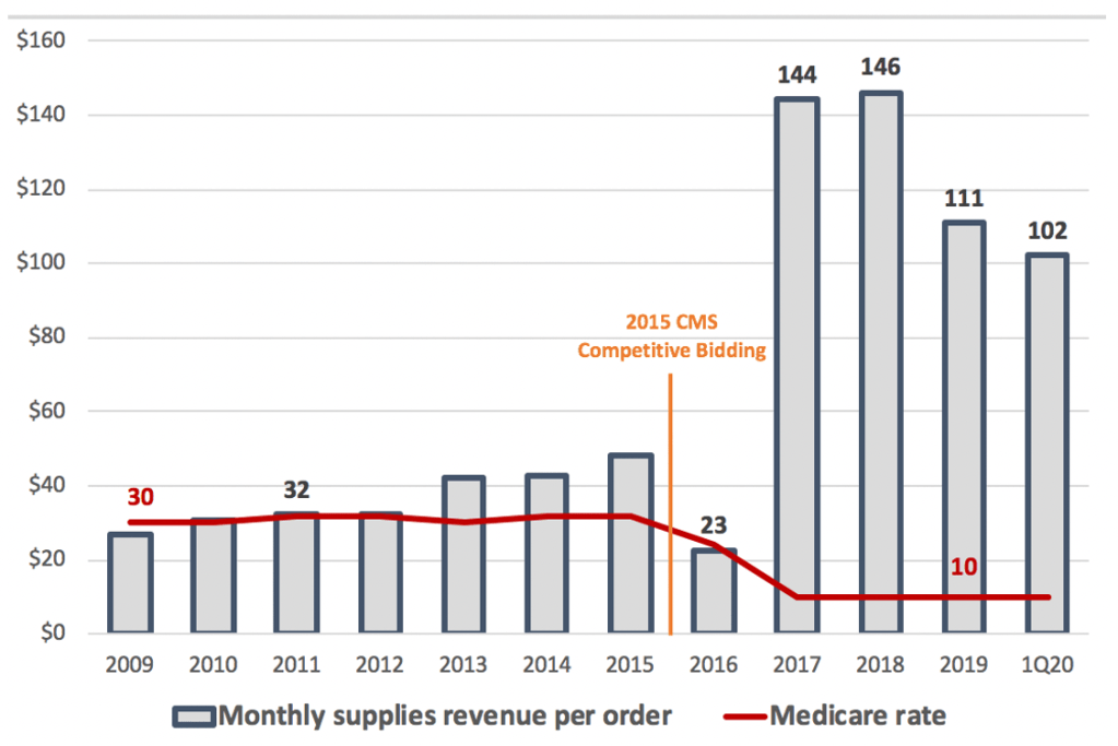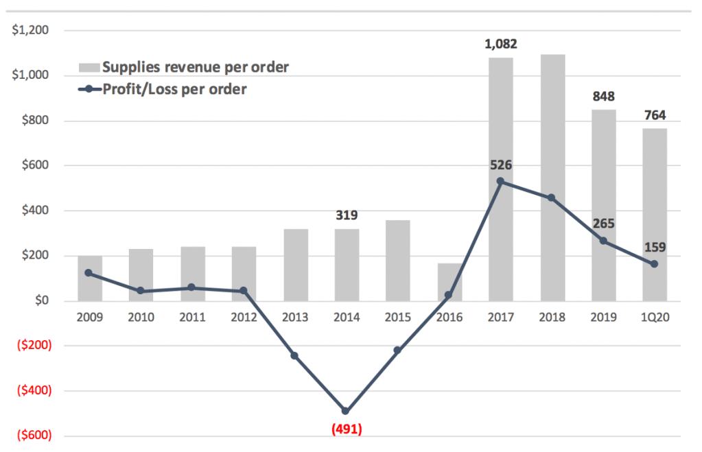 Applied to 2019 results, this would’ve cut average supplies revenue per order from $832 to $300 and total revenues by nearly 50%, dropping gross margins to 62%.