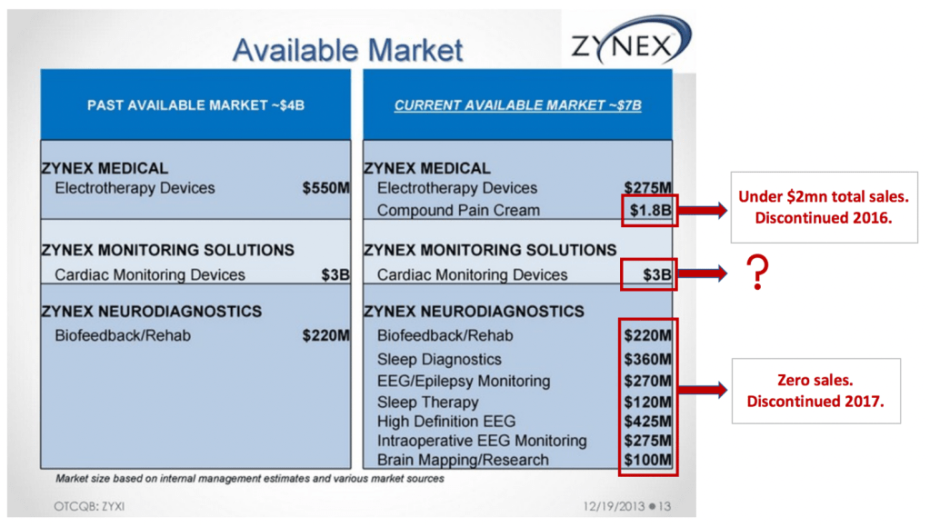 Investors should note that Zynex has repeatedly touted new products in the past, and all were unequivocal failures. These include a compound pain cream Zynex called a $1.8bn opportunity, and various products in it’s now closed NeuroDiagnostics segment (another $1.8bn TAM). Below is a slide from a 2013 investor presentation (our marks in red).