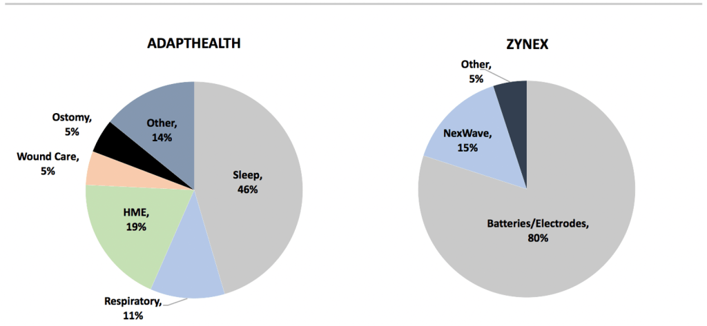 Finding an appropriate DME supplier comp for Zynex was only possible recently when AdaptHealth (NASDAQ: AHCO) went public late last year. AHCO distributes a broad set of home medical equipment (HME) across a variety of product categories including sleep apnea, supplemental oxygen, general HME and supplies. Started in 2012, AHCO’s strategy involves growing through acquisitions of smaller regional companies, and realizing cost efficiencies with a differentiated technology system that automates many critical parts of the DME business through e-prescribing, automated patient outreach and order intake.