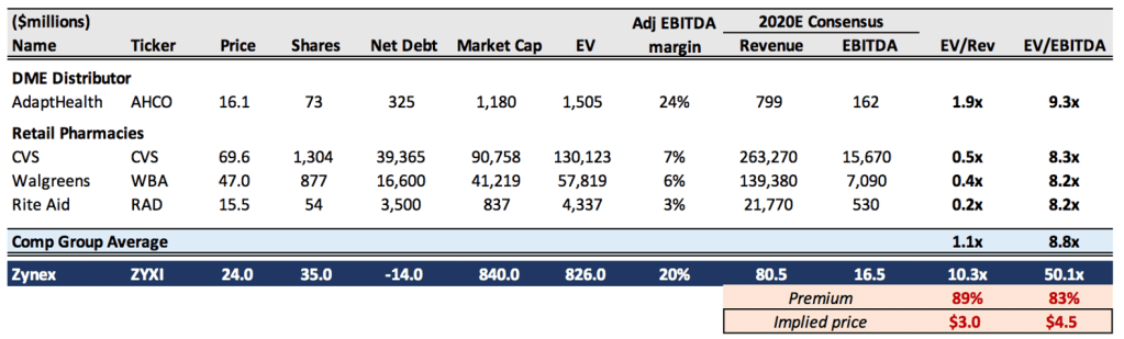 However, the names in our comp group don’t carry the same regulatory and reimbursement risks that Zynex does. In our base case, these risks materialize and reimbursement rates are reset to “normal” levels.