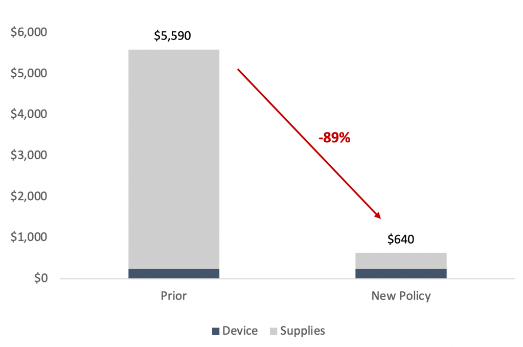 Using Zynex’s stated average reimbursement duration per device of 10 months, we estimate that UHC’s new policy could reduce its payments to Zynex by ~90%.