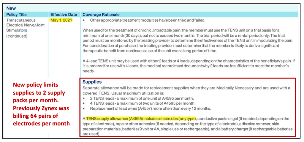 Unfortunately for Zynex, UHC eventually woke up. In February 2021, UHC announced a new coverage policy for TENS effective May 2021 which specifies the quantity of supplies allowed per prescription. The policy stipulates “usual maximum utilization” is one or two units of a monthly supply pack which includes electrodes, batteries, and conductive gel.