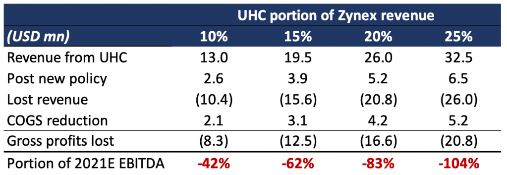 - We find UHC recently changed its TENS coverage policy which may lower its payments to Zynex by 80% – equivalent to 40-100% of 2021 EBITDA