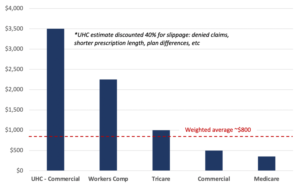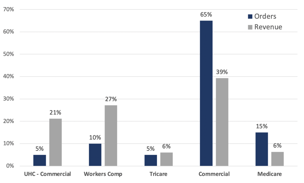 Not only will Zynex lose revenue – it’s margins will be materially impacted. We estimate the average reimbursement per UHC order was ~5x the ex-UHC average, skewing the overall average higher and making a big contribution to margins. Using Medicare’s fee schedule, our estimate of commercial insurance reimbursement and our work on UHC, we estimate reimbursement by payor and worker’s comp orders which we think lie somewhere in the middle:
