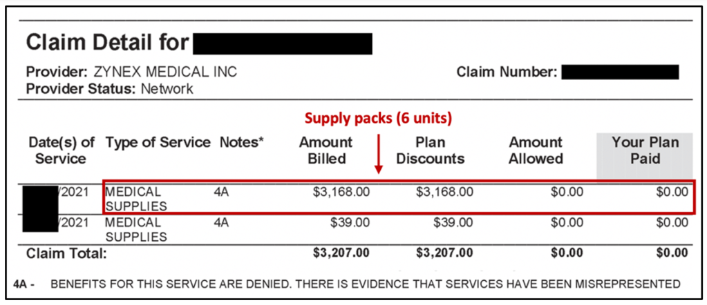 The most recent claim was denied due to “evidence that services have been misrepresented”. Here, UHC reviewed the claim and determined that 6 units of the supply pack, instead of 1 or 2, was a misrepresentation of provided services.