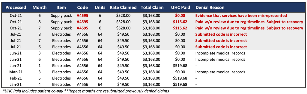 After two months, concerned about their potential co-pay obligations the patient reported the excessive quantities to UHC which flagged the patient’s file and led to denials of 4 of 8 submitted claims. Relevant for Zynex investors is the change in denial reasons.